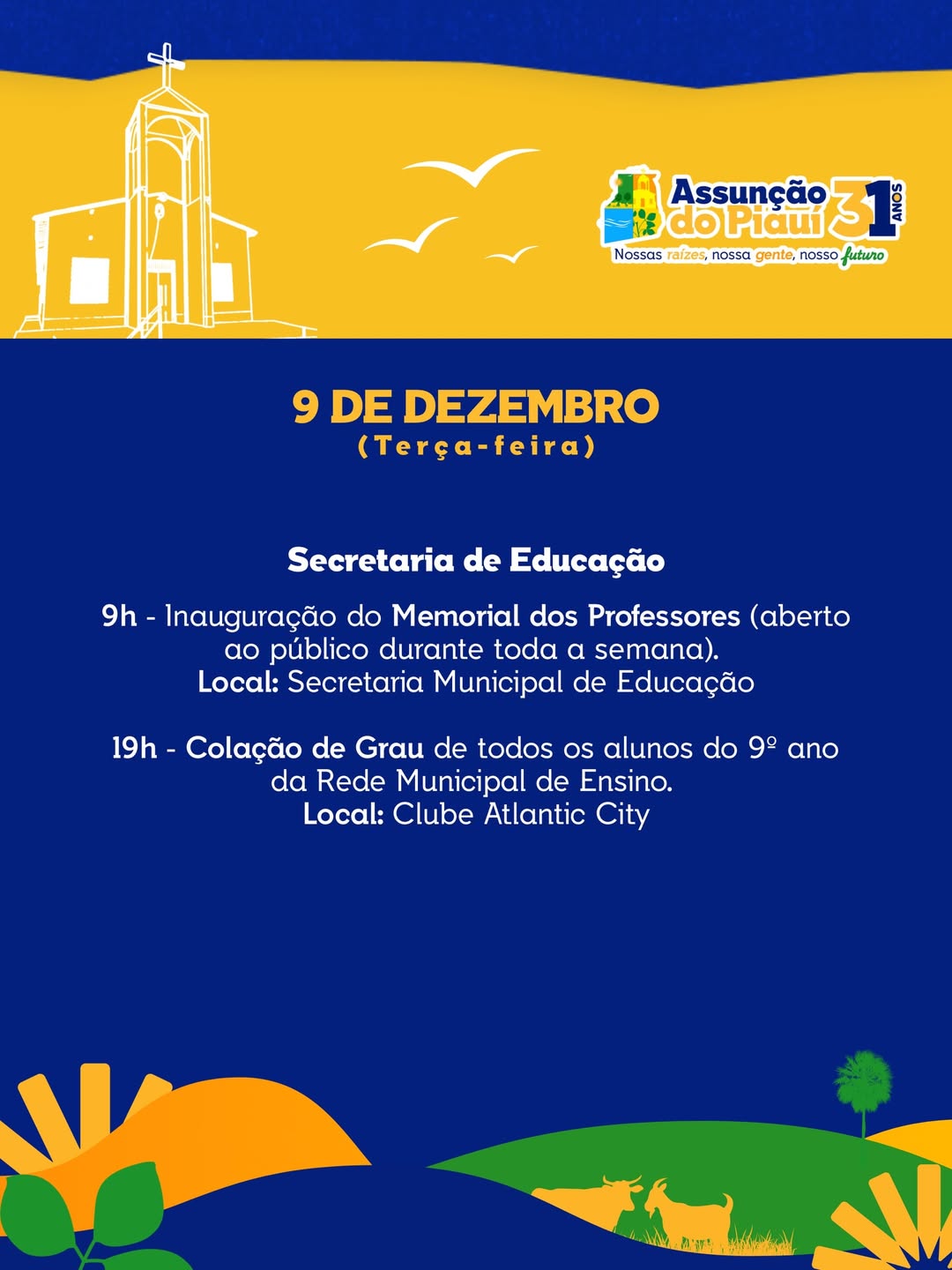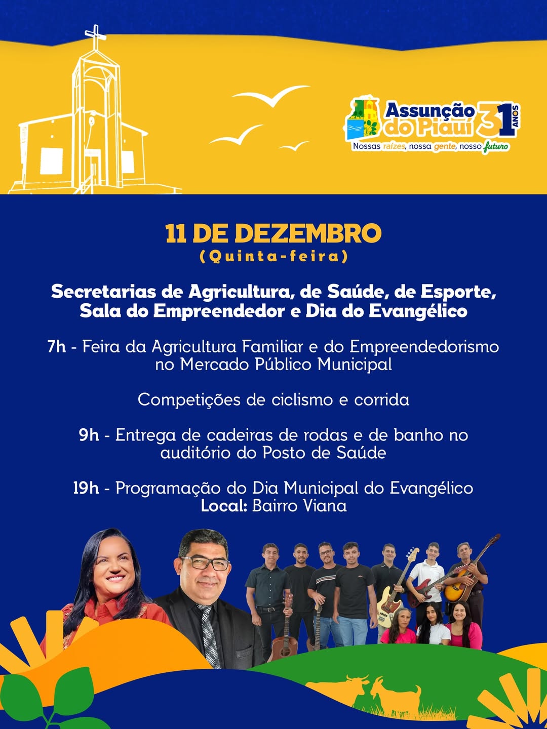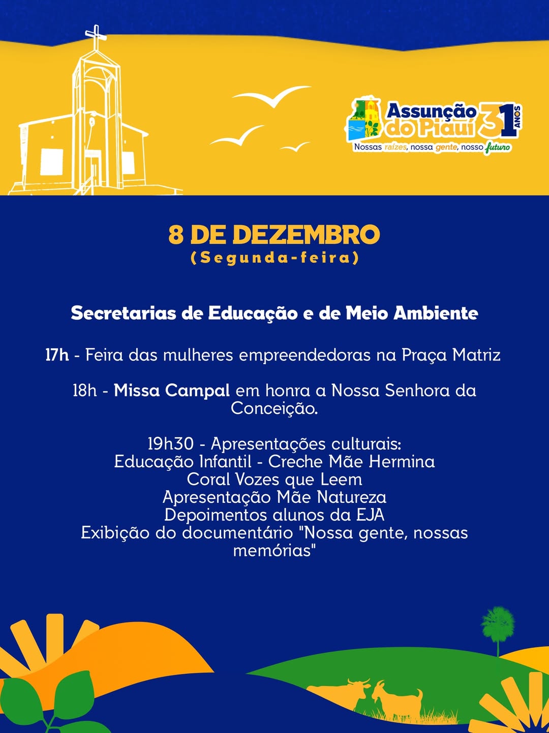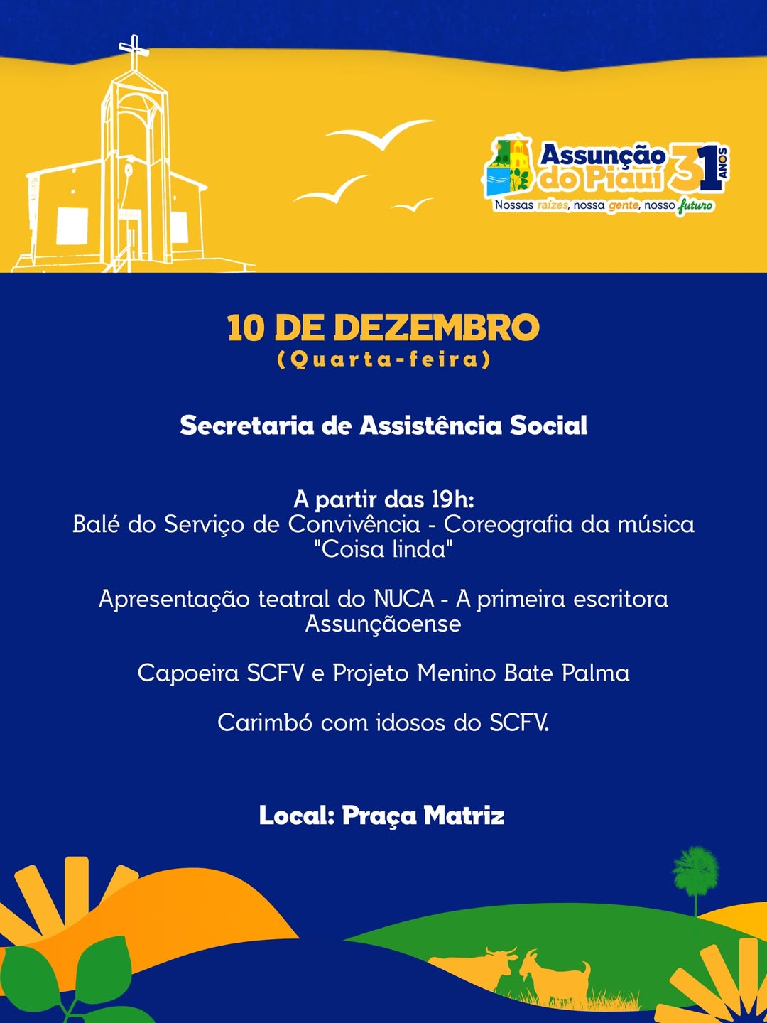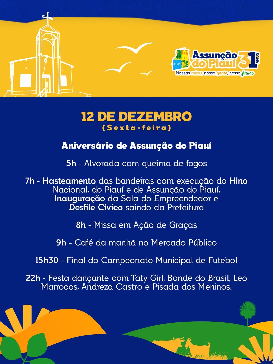 Faltando apenas dez dias para o aniversário de 31 anos de Assunção do Piauí, a Prefeitura Municipal divulgou oficialmente a programação completa da Semana do Município. O cronograma reúne ações culturais, esportivas e institucionais que celebram a história e o desenvolvimento da cidade, marcando uma das datas mais significativas para a população local.