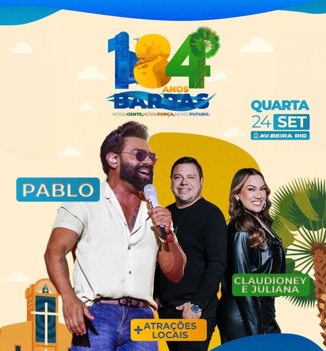 O município de Barras vai comemorar seus 184 anos de história nos dias (22/09), (23/09) e (24/09), com uma programação especial na Av. Beira Rio. O evento promete reunir a população para celebrar a trajetória da cidade, marcada por conquistas e tradição.