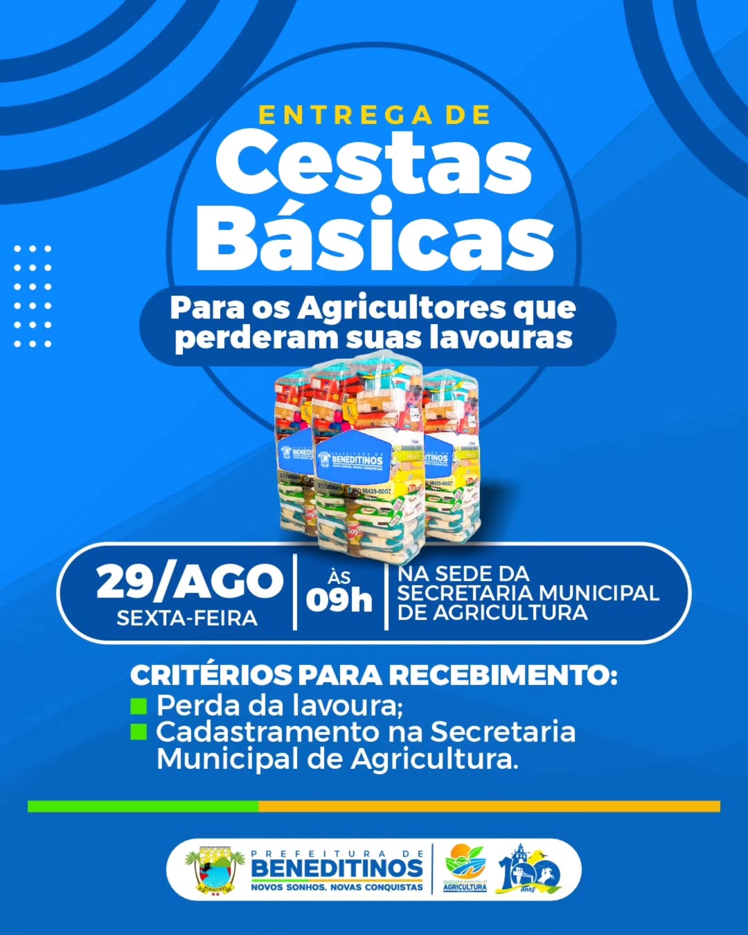 A entrega das cestas básicas será realizada nesta sexta-feira, 29 de agosto de 2025, às 9h, na sede da Secretaria Municipal de Agricultura.