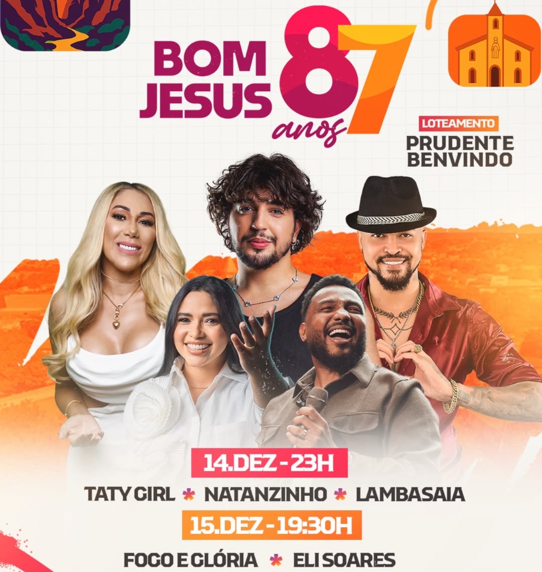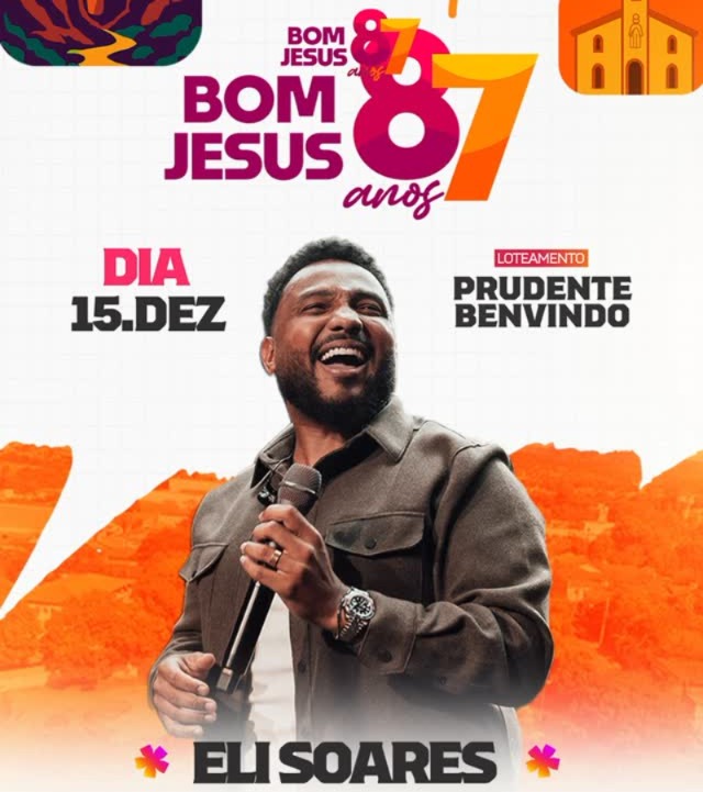 O município de Bom Jesus se prepara para uma noite de fé, emoção e celebração no próximo dia (15/12), em comemoração aos seus 87 anos de história. A programação especial contará com duas grandes atrações da música gospel: a Banda Fogo e Glória e o cantor Eli Soares, nomes que prometem conduzir o público a um momento marcante de louvor e adoração.