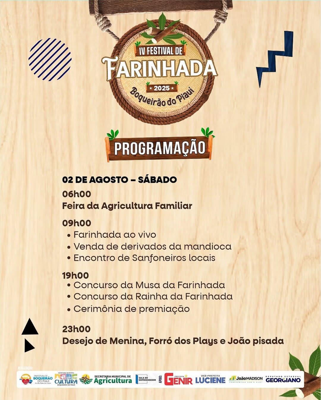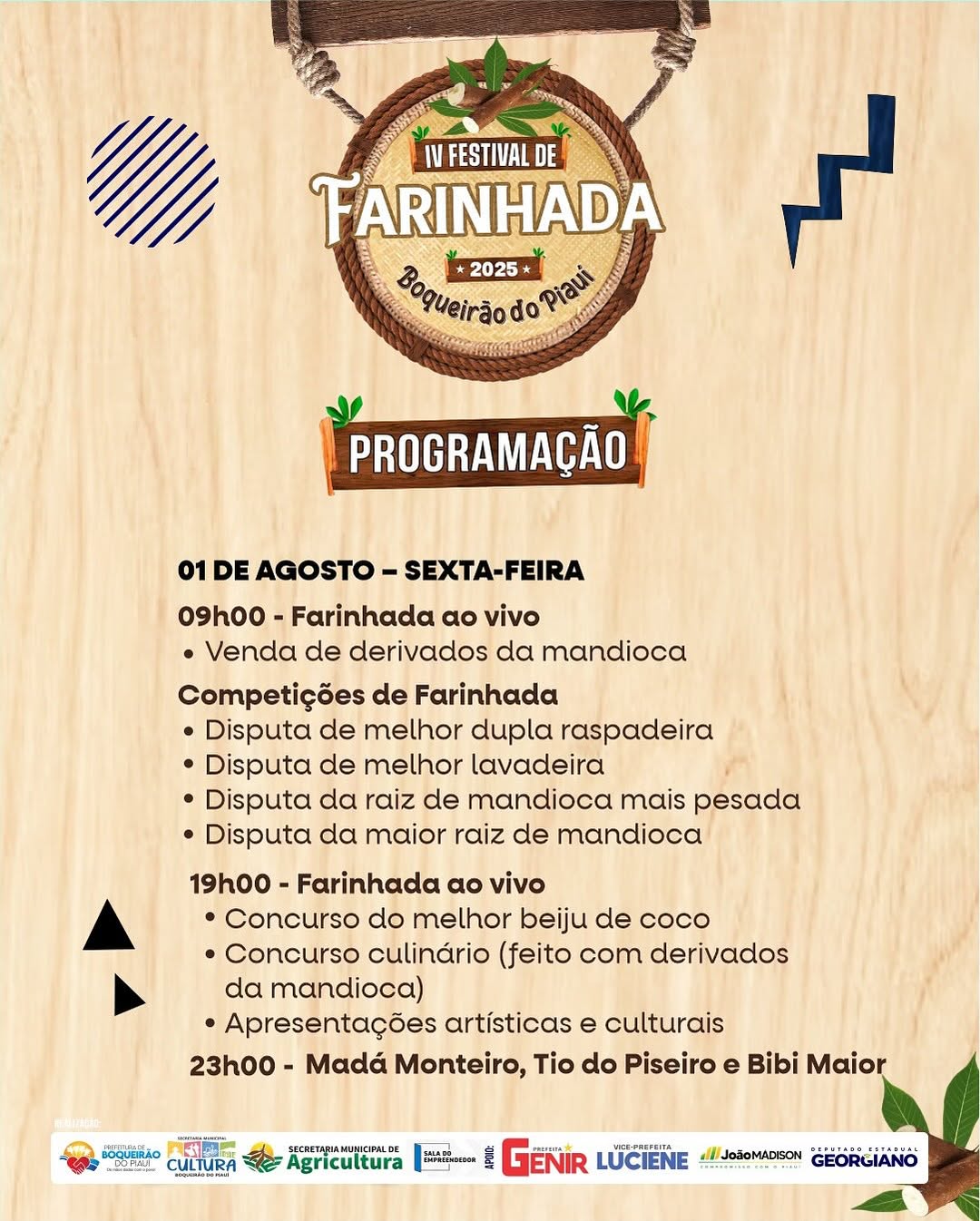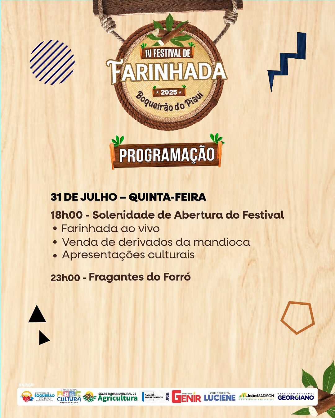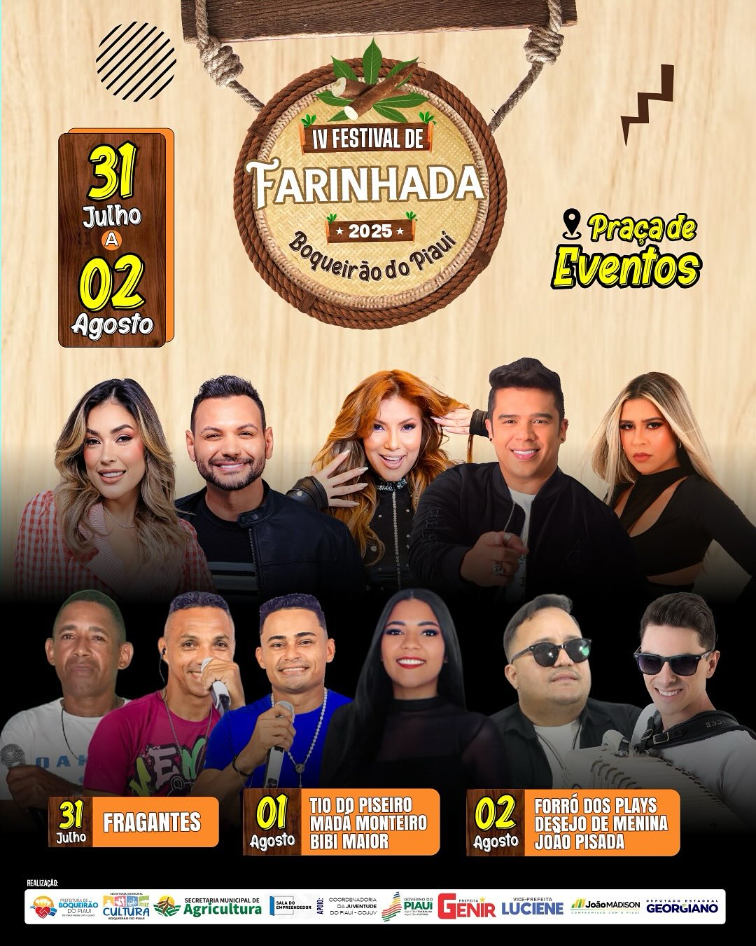 Entre os dias (31/07) e (02/08), Boqueirão do Piauí será palco de uma das celebrações culturais mais aguardadas da região: a Festa da Farinhada. Reconhecida como a “Capital da Farinhada”, a cidade se transforma para receber moradores e visitantes em uma programação repleta de tradição, música, gastronomia e alegria popular.