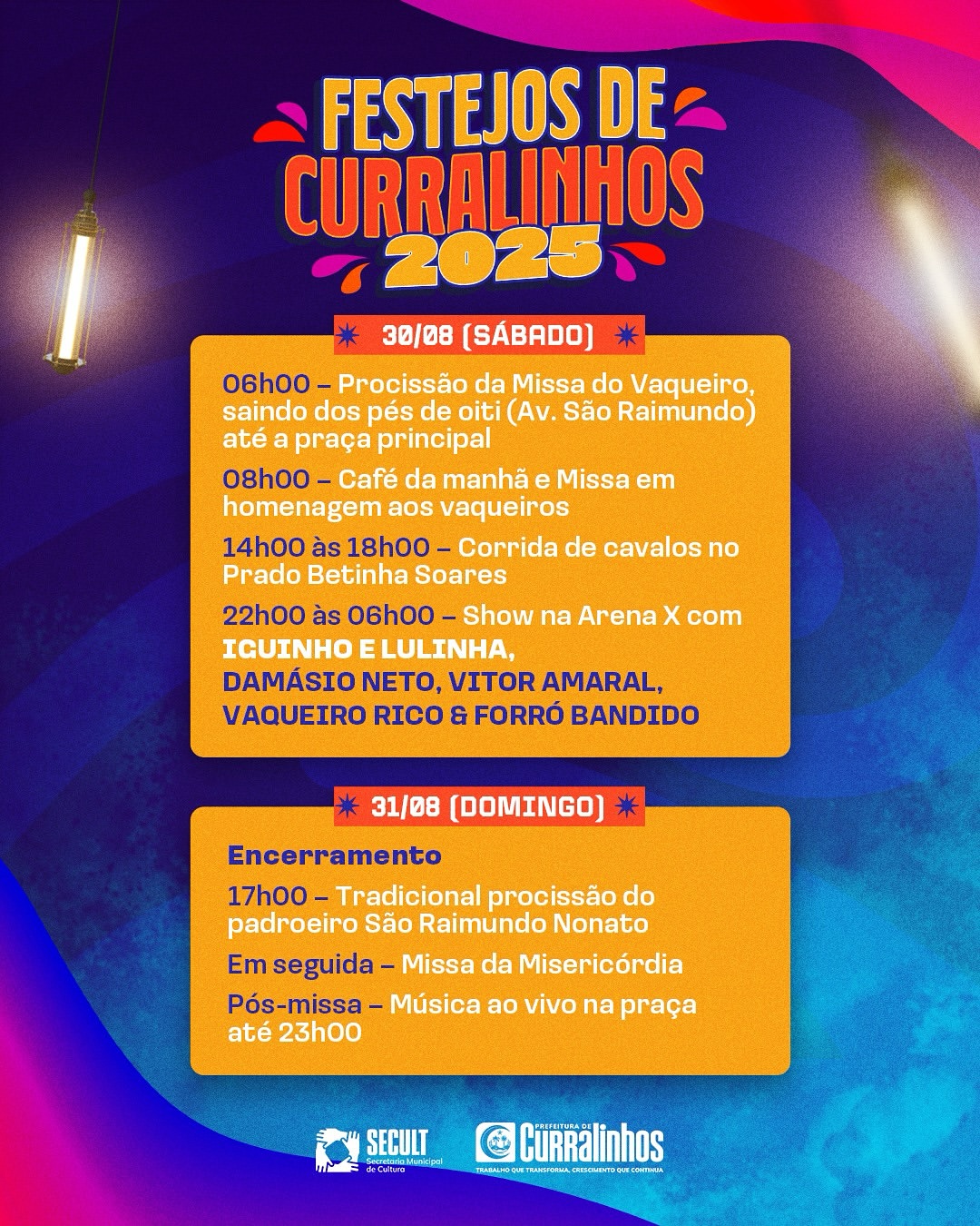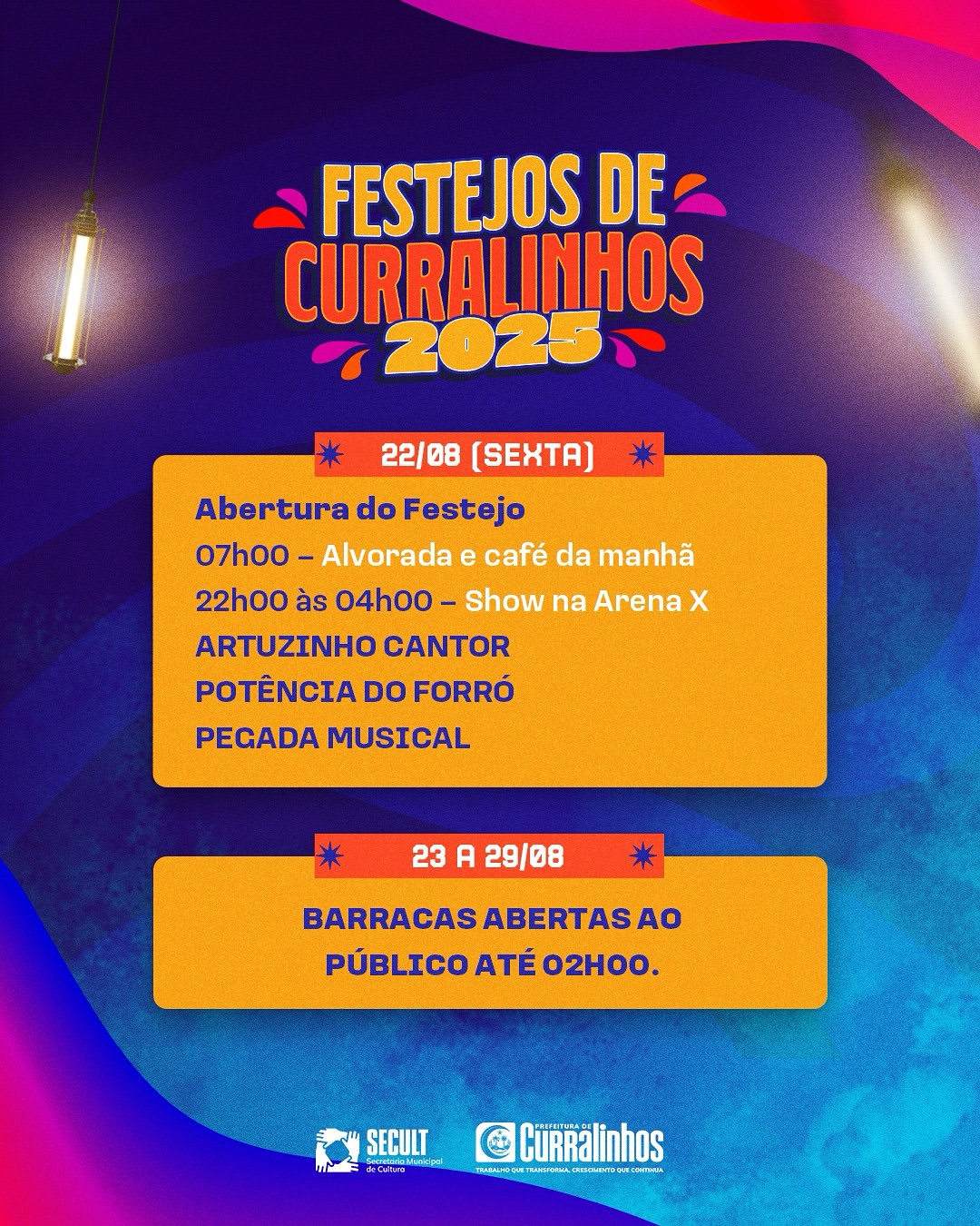 A cidade de Curralinhos já está em contagem regressiva para os Festejos 2025, que acontecem de 22 a 31 de agosto. Serão dias de fé, tradição e muita alegria, reunindo moradores e visitantes em uma programação diversificada.