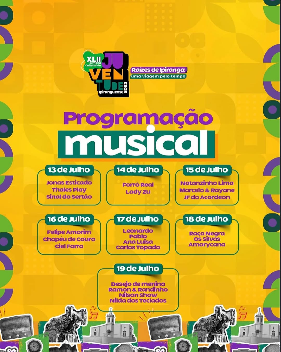 A Prefeitura de Ipiranga do Piauí anunciou oficialmente a aguardada programação musical da 42ª Semana Cultural da Juventude Ipiranguense, que ocorrerá de (13/07) a (19/07). Com o tema “Raízes de Ipiranga: uma viagem pelo tempo”, o evento busca valorizar a identidade local, promovendo cultura, arte e entretenimento em uma das semanas mais emblemáticas do calendário municipal.