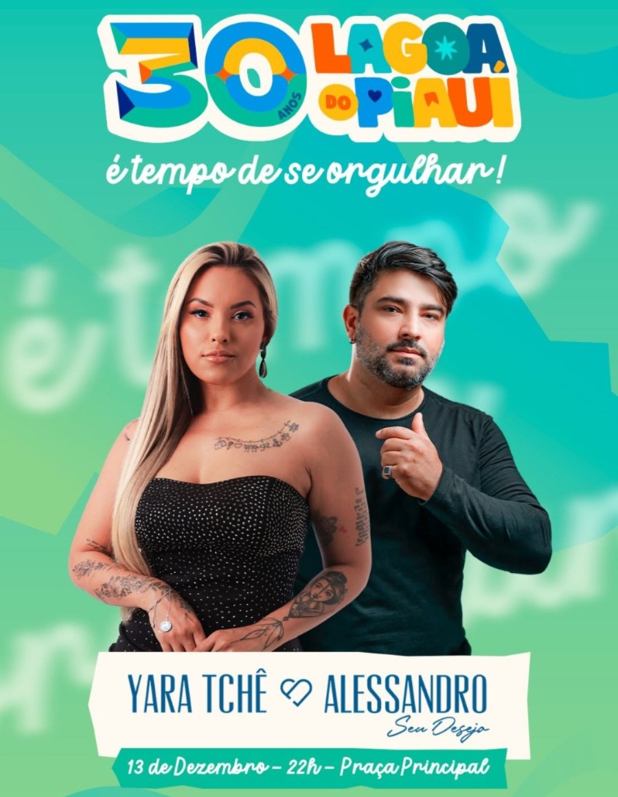 A prefeita Camila Barbosa anunciou a presença da dupla Yara Tchê e Alessandro, da banda Seu Desejo, como uma das grandes atrações das comemorações pelo aniversário de Lagoa do Piauí. O evento está marcado para o dia (13/12) e promete movimentar a cidade com uma das apresentações mais aguardadas do público local.