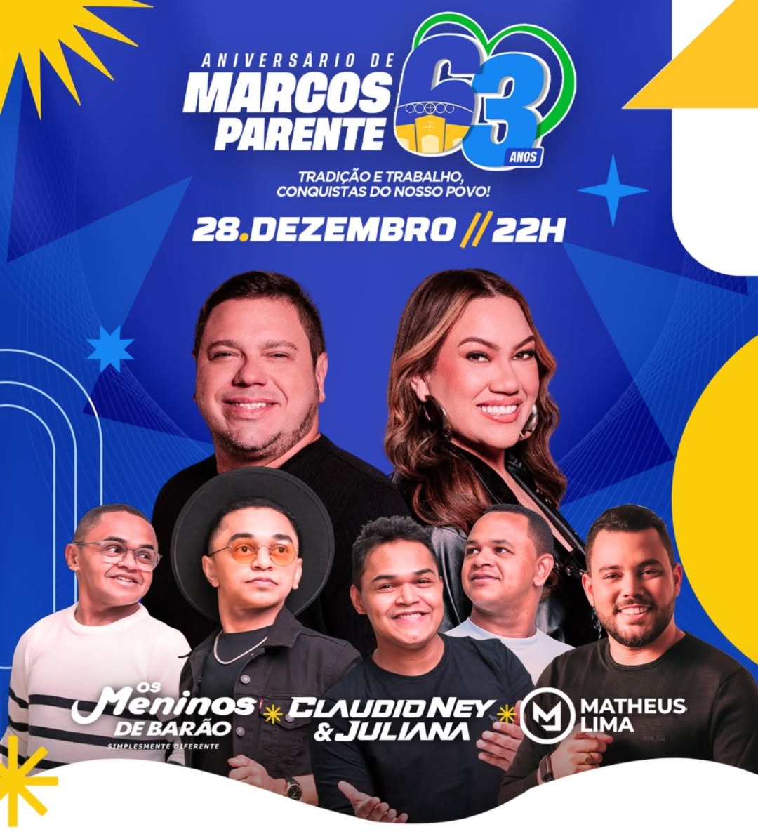 A festa acontece no dia (28/12), a partir das 22h, na praça pública. A expectativa é de grande participação popular, consolidando o aniversário de Marcos Parente como um dos momentos mais aguardados do ano no município.