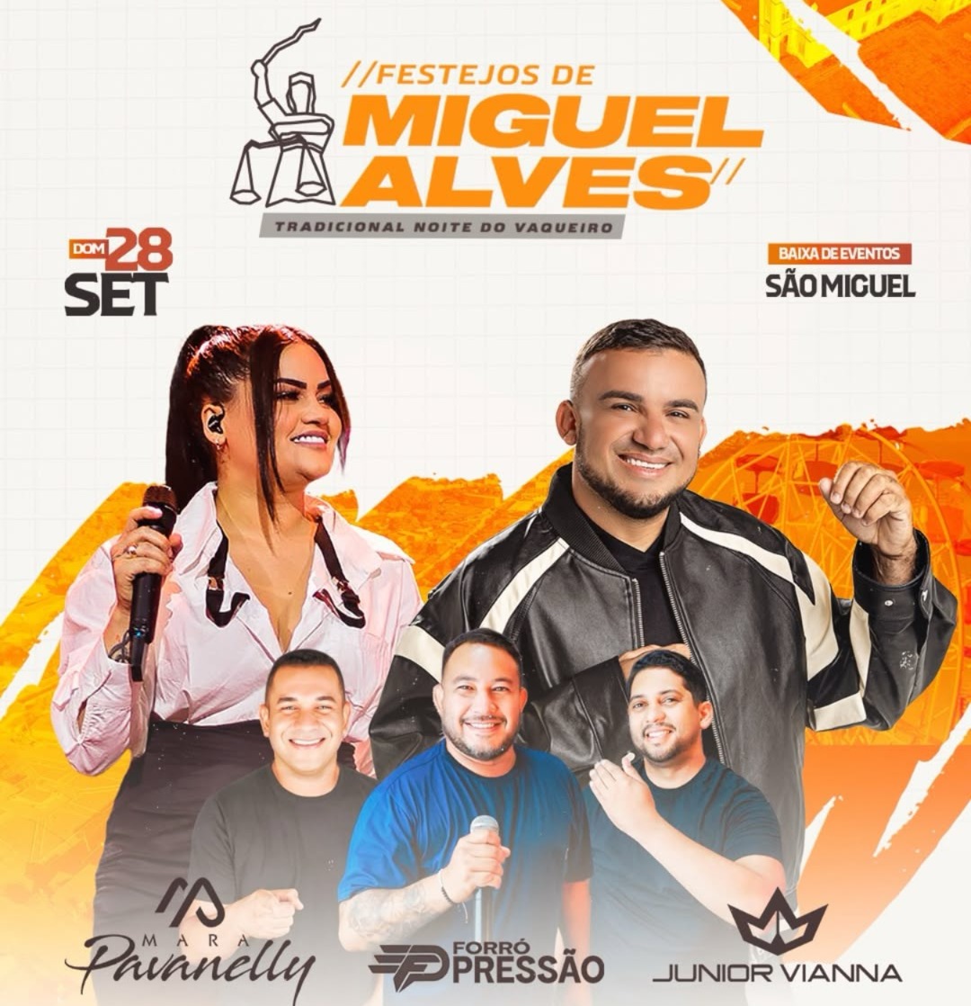 Os Festejos de São Miguel Arcanjo seguem movimentando Miguel Alves com muita fé, tradição e cultura. Entre os momentos mais aguardados da programação está a Tradicional Noite do Vaqueiro, que será realizada no dia (28/09), na Baixa de Eventos São Miguel.