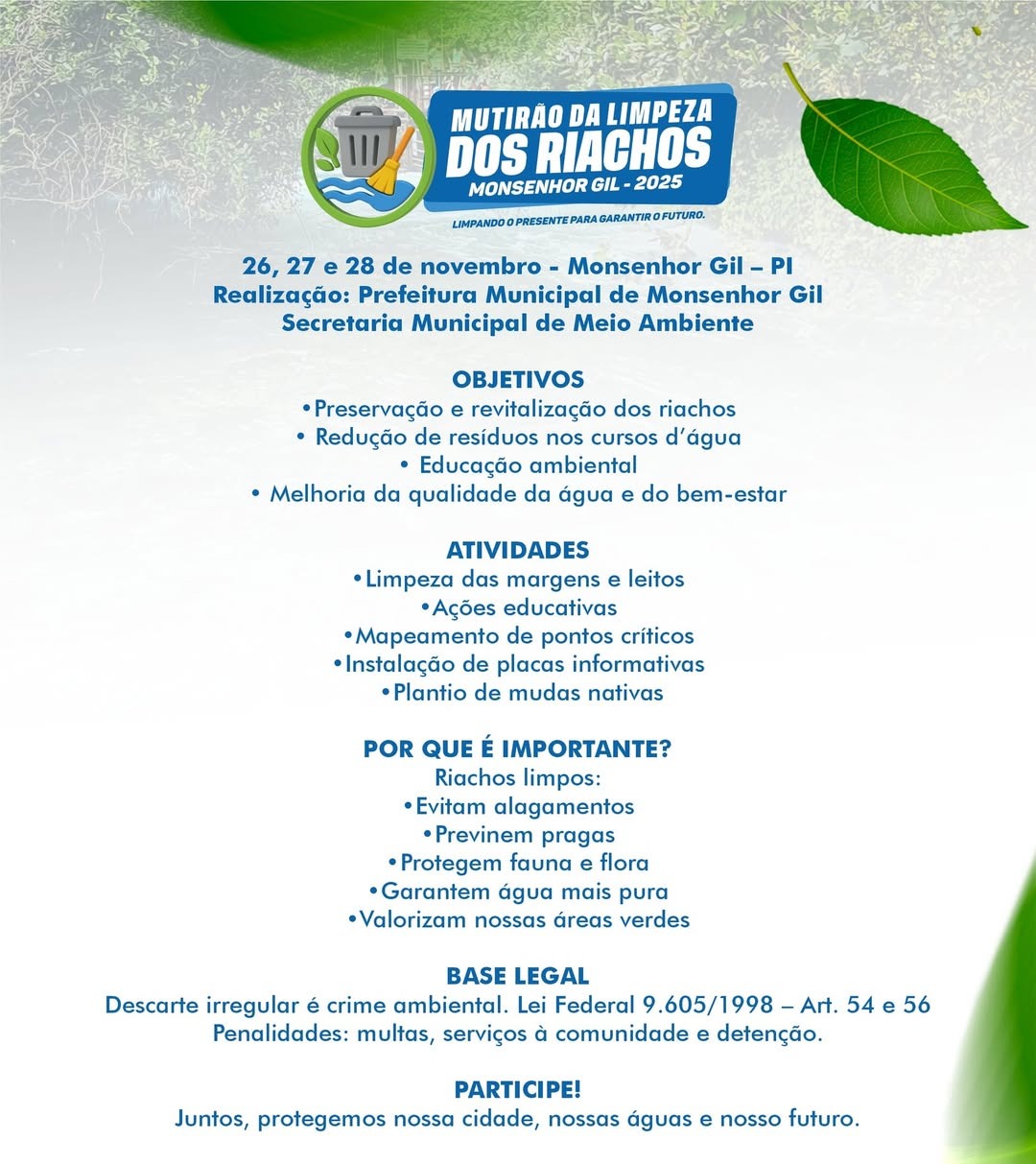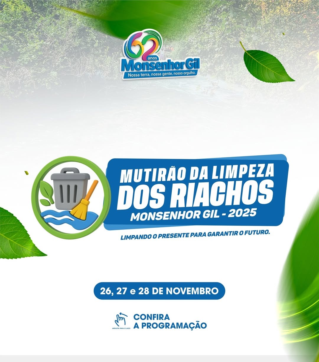 A Prefeitura de Monsenhor Gil se prepara para dar início, nesta quarta (26/11), ao Mutirão da Limpeza dos Riachos, ação que carrega o tema “Limpando o presente para garantir o futuro”. A iniciativa, coordenada pela Secretaria Municipal de Meio Ambiente, será realizada nos dias (26/11), (27/11) e (28/11) e promete mobilizar servidores e moradores na proteção das áreas naturais do município.