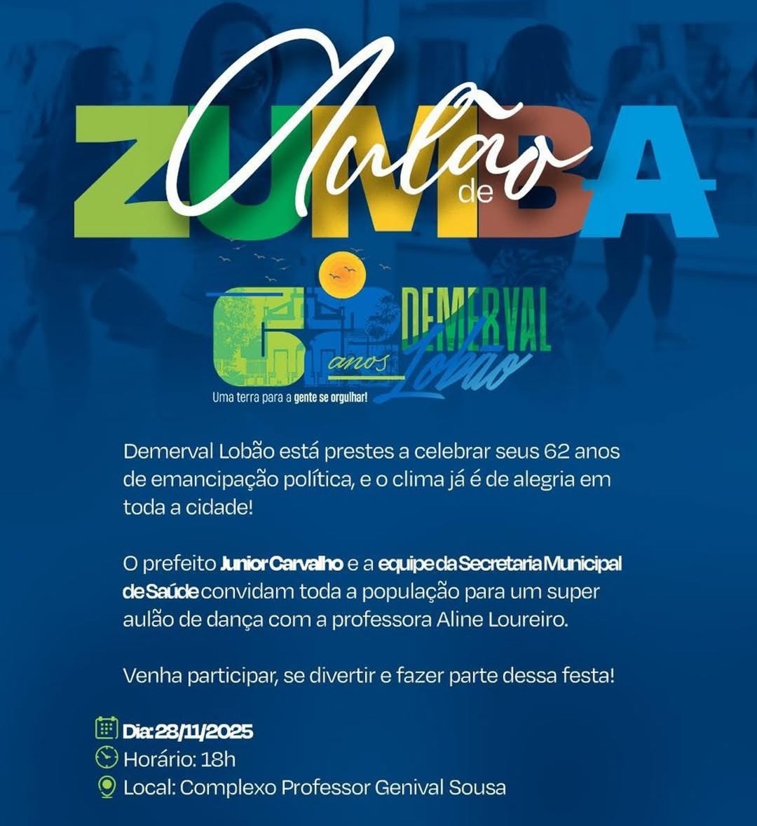A Prefeitura, por meio do prefeito Junior Carvalho e da Secretaria Municipal de Saúde, organiza um super aulão de dança comandado pela professora Aline Loureiro. A atividade vai acontecer no dia 28 de novembro de 2025, às 18h, no Complexo Professor Genival Sousa, oferecendo à população um momento de descontração e incentivo à prática de hábitos saudáveis.