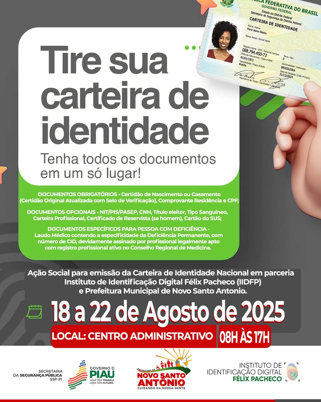 A Prefeitura Municipal de Novo Santo Antônio, em parceria com o Governo do Estado e o Instituto de Identificação Digital Félix Pacheco, está promovendo uma importante ação de cidadania para a população.
