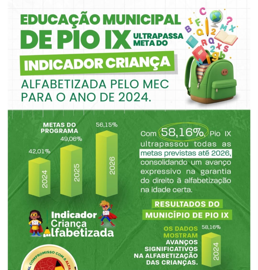 A Educação Municipal de Pio IX celebra um avanço significativo ao atingir 58,16% no Indicador Criança Alfabetizada, superando a meta estabelecida para 2024 e ultrapassando também as projeções previstas para 2025 e 2026. O resultado reflete o trabalho contínuo da rede municipal em garantir o aprendizado adequado na idade certa.