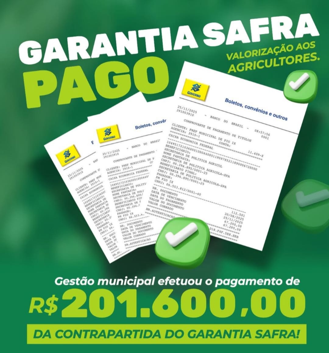 A Prefeitura de Pio IX confirmou a realização do pagamento da contrapartida municipal do programa Garantia-Safra. A medida assegura que agricultores locais inscritos no benefício tenham acesso ao auxílio em casos de perda de safra por estiagem ou excesso de chuvas, garantindo mais segurança financeira para as famílias que dependem da produção agrícola.