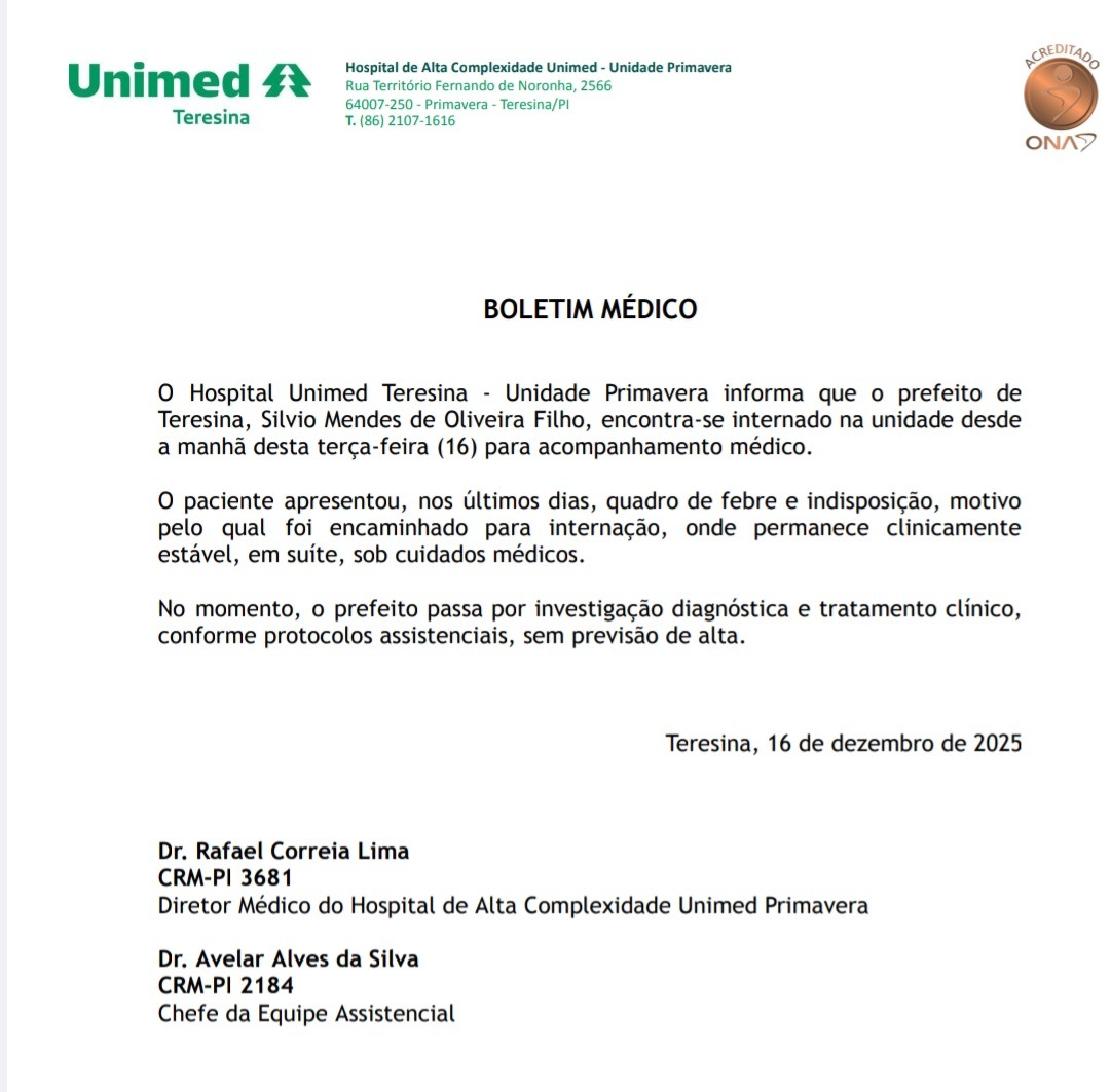 O Hospital Unimed Primavera comunicou, na tarde desta terça-feira (16/12), que o prefeito de Teresina, Sílvio Mendes (UB), permanece internado sem previsão de alta. O gestor, de 76 anos, deu entrada na unidade hospitalar por recomendação médica após apresentar febre e mal-estar, passando por uma série de exames para avaliação detalhada de seu estado de saúde.