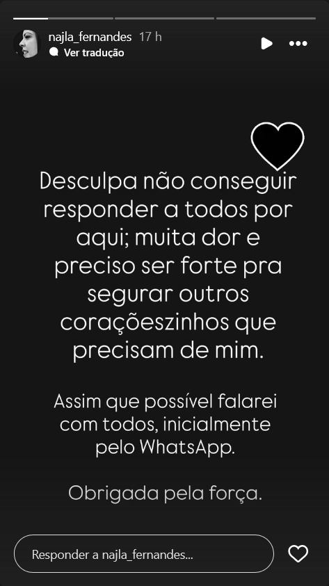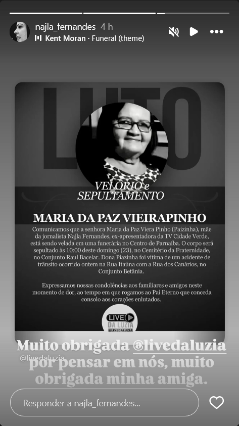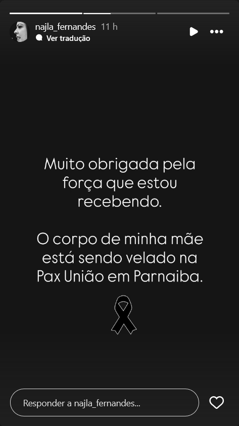 Em publicação nas redes sociais, Nájila Fernandes comentou que está recebendo apoio de familiares e amigos, mas ainda enfrenta um momento de muita dor. Ela explicou que o corpo de sua mãe está sendo velado na Pax União, em Parnaíba, e informou que o sepultamento ocorrerá às 10h deste domingo (23/11), no Cemitério da Fraternidade, no Conjunto Raul Bacelar.
