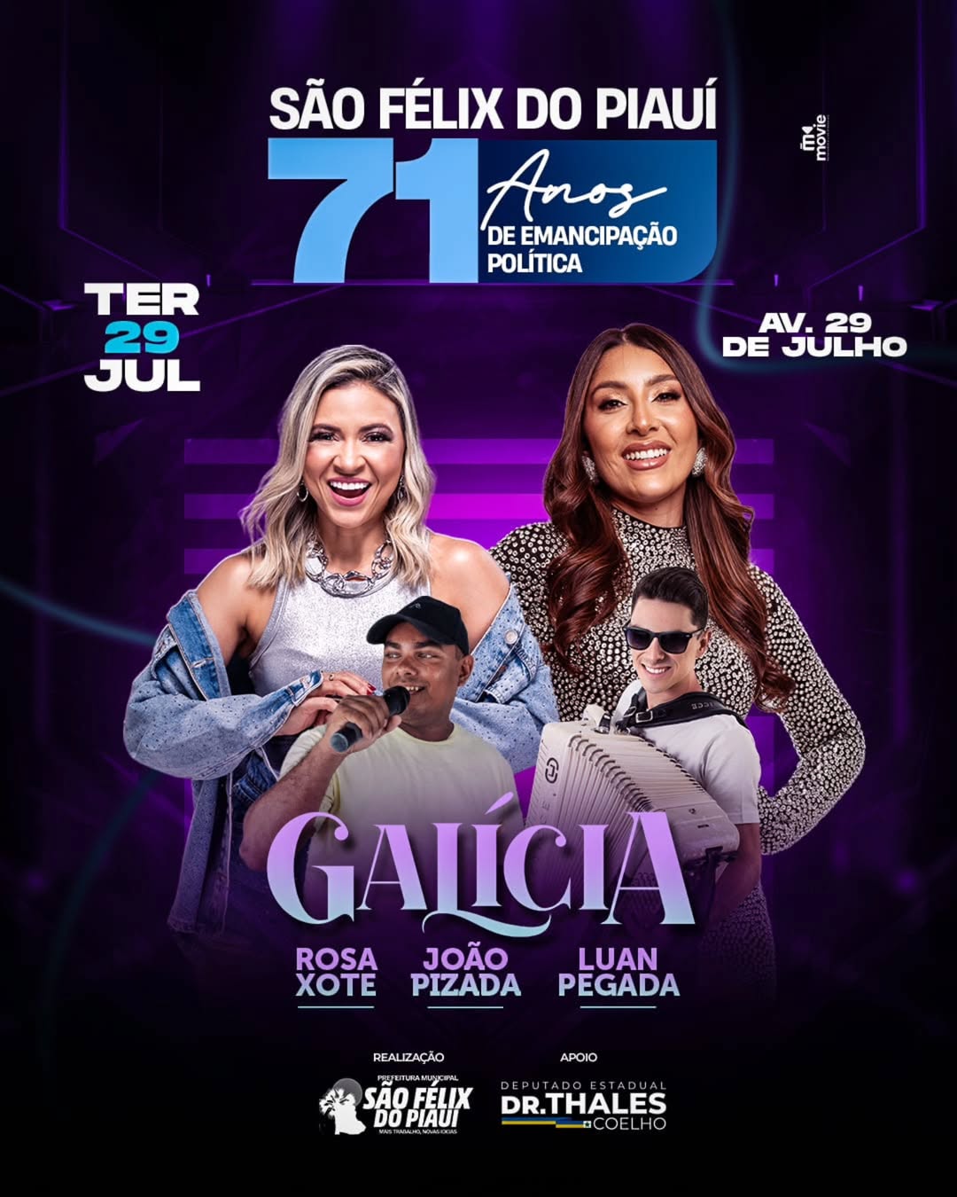 O município de São Félix do Piauí se prepara para uma noite de festa e celebração no próximo dia (29/07), em comemoração aos 71 anos de sua emancipação política. A data será marcada por um grande show ao ar livre na Avenida 29 de Julho, a partir das 20h, reunindo atrações que prometem animar o público e atrair visitantes de toda a região.