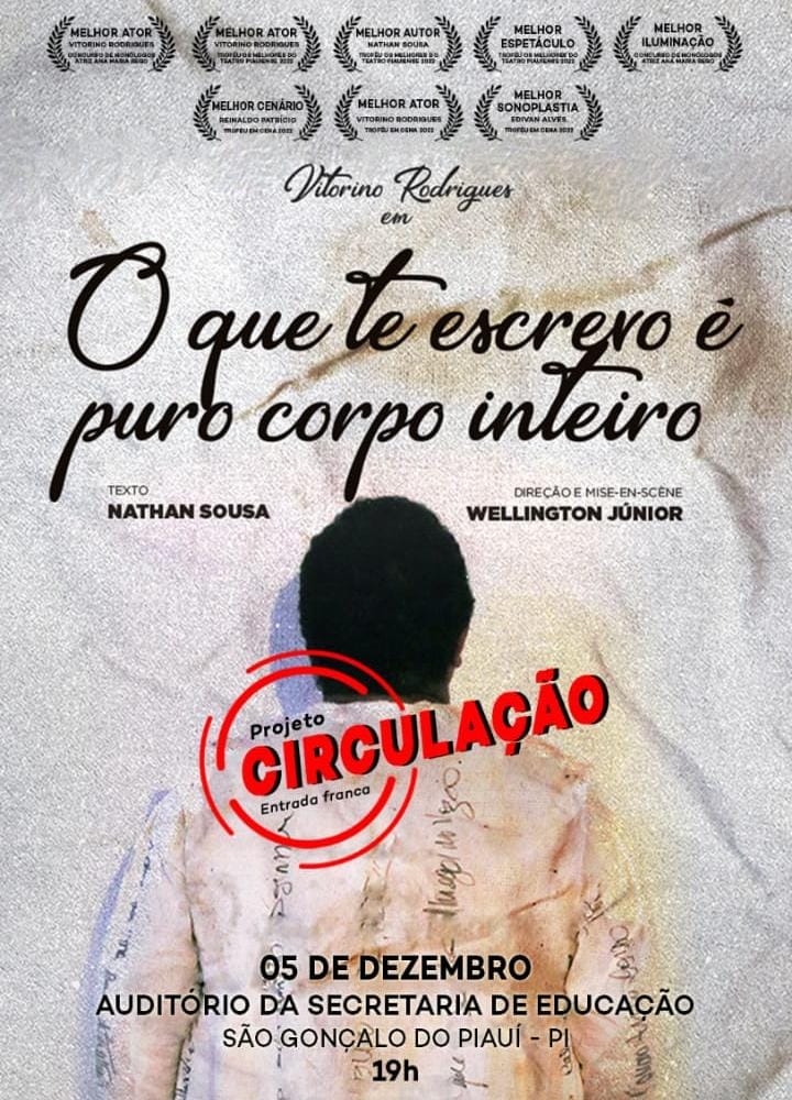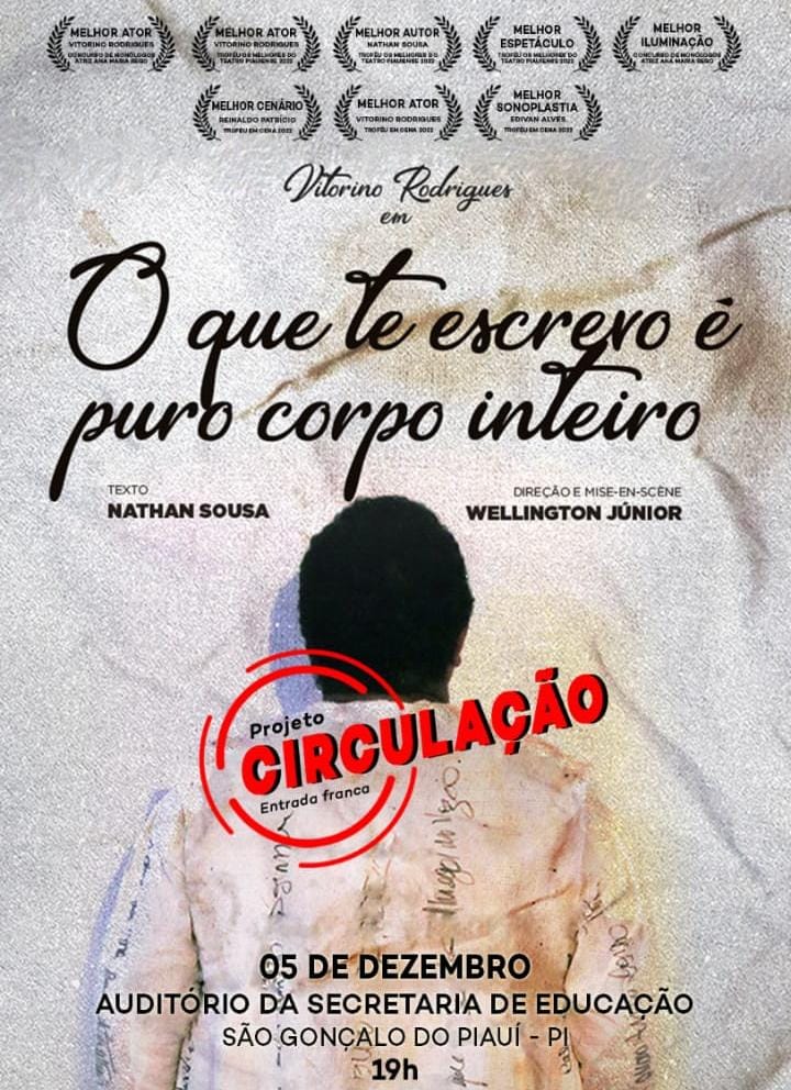 No dia (05/12), a partir das 19h, o auditório da Secretaria de Educação de São Gonçalo do Piauí receberá a peça O Que Te Escrevo é Puro Corpo Inteiro, considerada uma das produções teatrais piauienses mais premiadas dos últimos anos. O espetáculo marca um momento importante para a cena cultural do município, que passa a integrar em sua programação uma obra reconhecida pela crítica e pelo público.