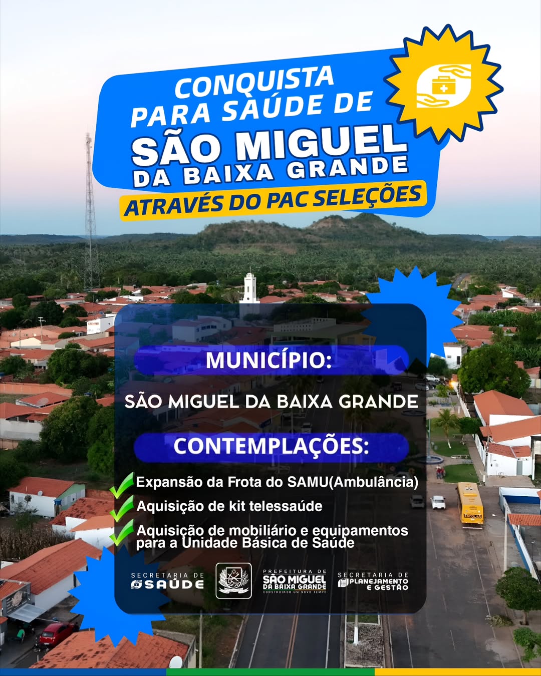 O município de São Miguel da Baixa Grande foi beneficiado com mais de R$ 3 milhões em investimentos por meio do resultado do Novo PAC Seleções, programa do Governo Federal voltado para a retomada e aceleração de obras e serviços públicos essenciais. Os recursos destinados à área da saúde visam fortalecer a infraestrutura e ampliar o atendimento à população local.