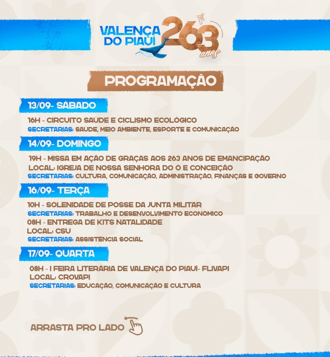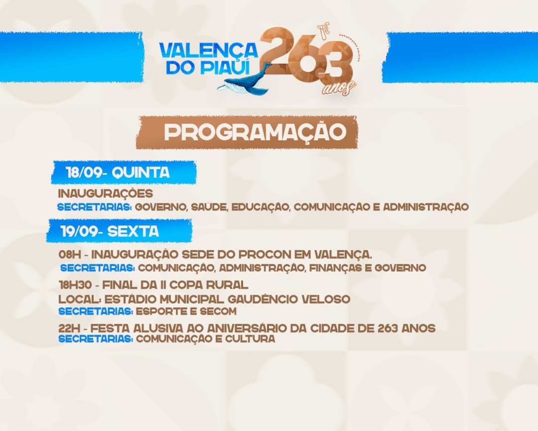 As comemorações terão início com solenidades oficiais e atividades voltadas para a valorização da história e da identidade valenciana, reforçando a importância da cidade no cenário do Piauí.