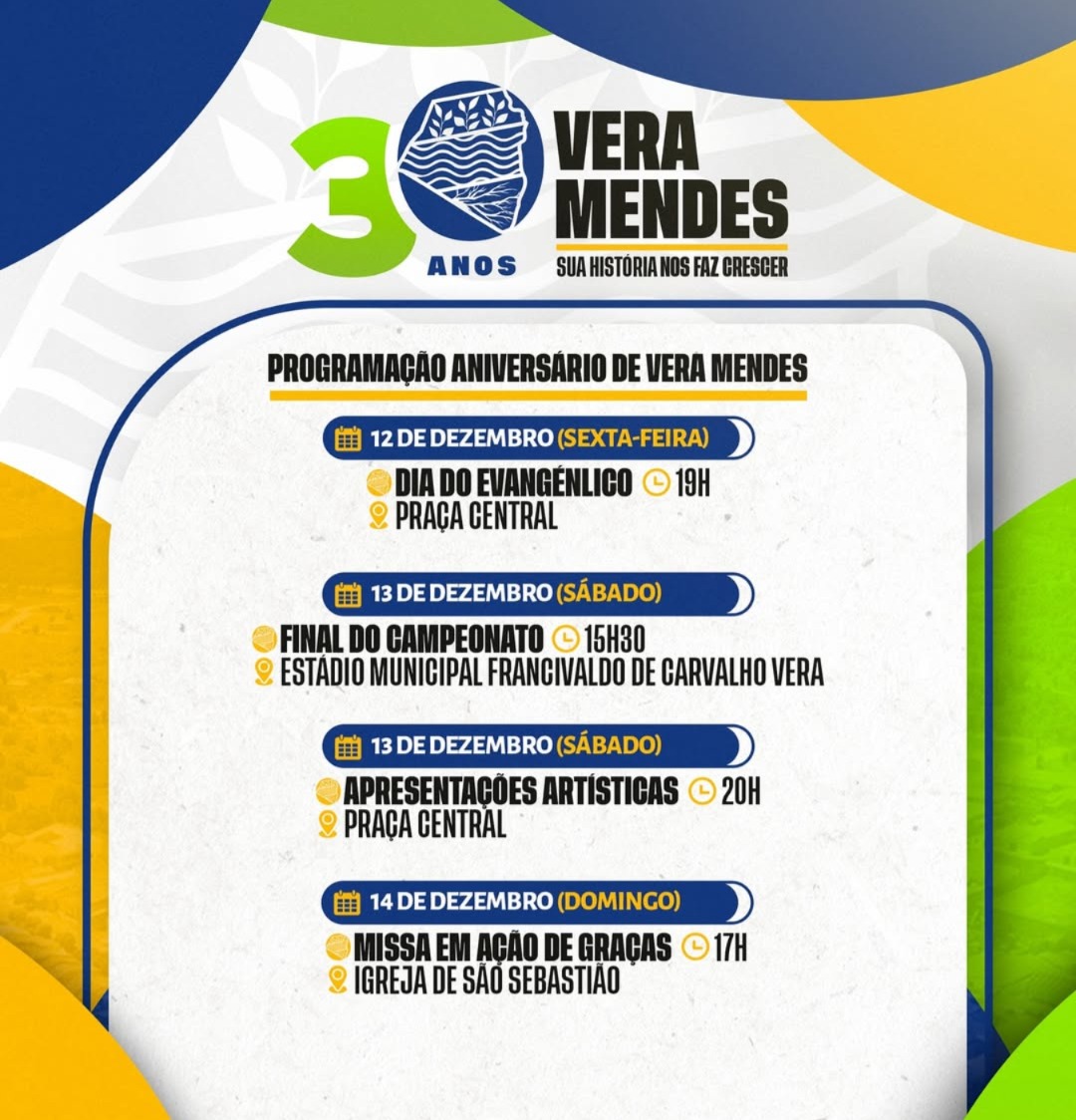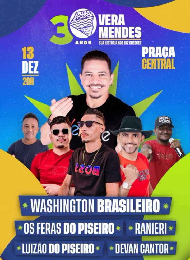 O município de Vera Mendes iniciou oficialmente a contagem regressiva para a maior celebração de seus 30 anos. A Prefeitura Municipal anunciou uma programação especial que promete reunir moradores e visitantes em uma noite de muita música, energia e valorização da história local. O evento será realizado no próximo dia (13/12), em praça pública.