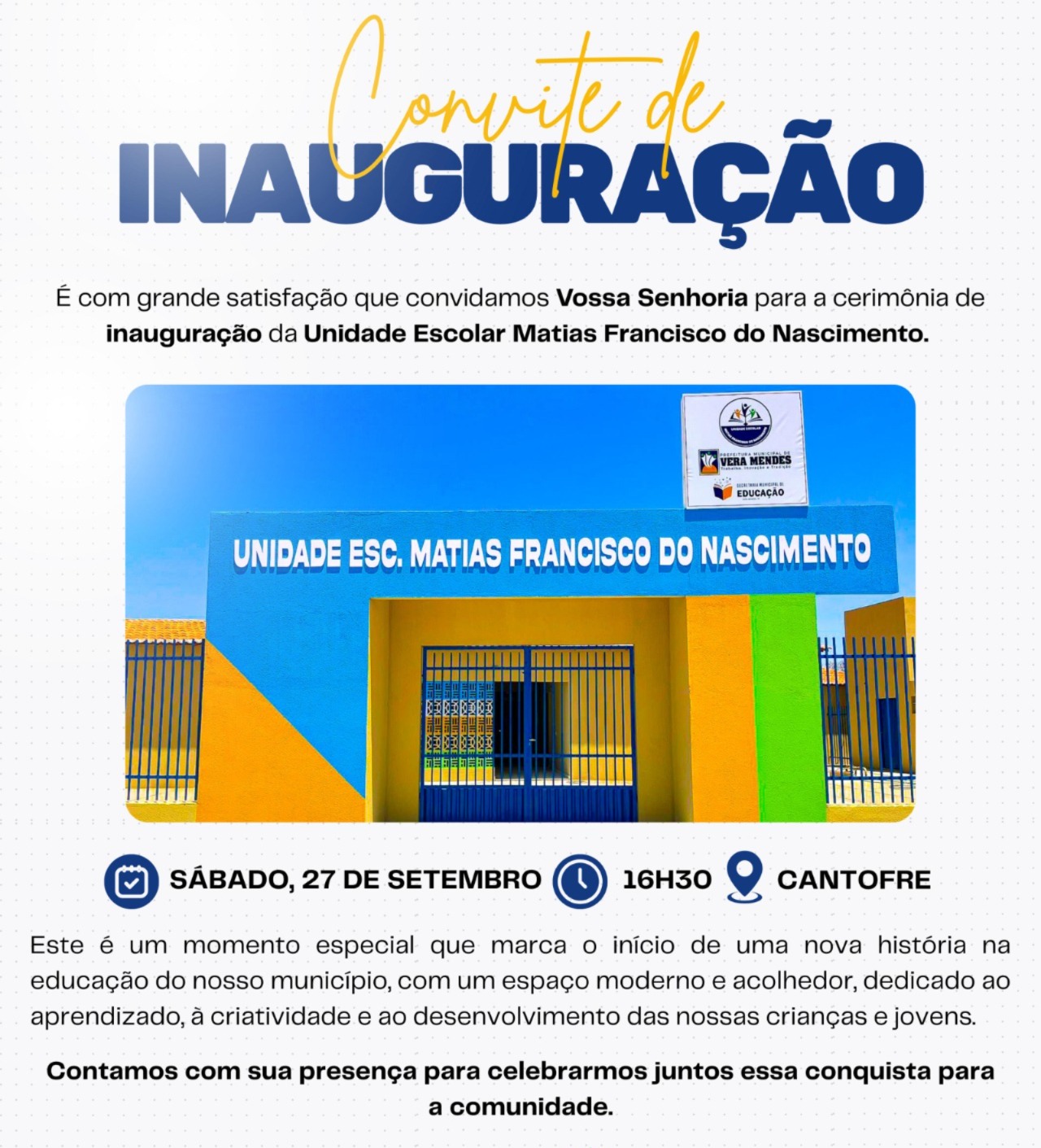 A Prefeitura de Vera Mendes realiza neste sábado, (27/09), a inauguração da Unidade Escolar Matias Francisco do Nascimento, localizada na comunidade Cantofre. A solenidade está marcada para as 16h30 e promete ser um momento de celebração para toda a população.