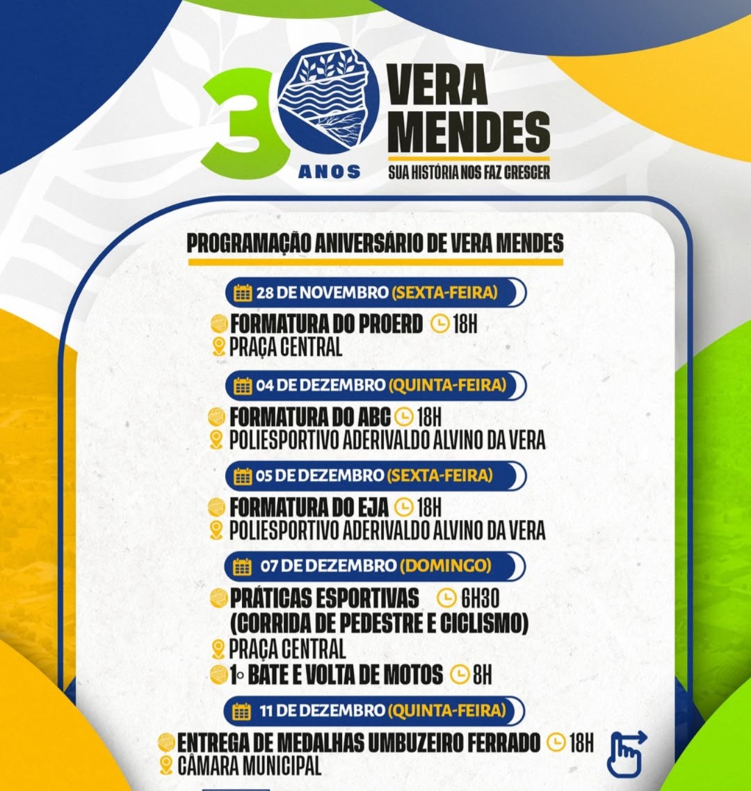 O município de Vera Mendes se prepara para viver um momento histórico: a comemoração dos 30 anos de emancipação política, marcada por uma grande programação que acontecerá entre os dias (28/11) e (14/12). Serão mais de duas semanas de celebrações que reúnem fé, cultura, esporte e muita emoção, valorizando a trajetória e as conquistas do povo veramendense.